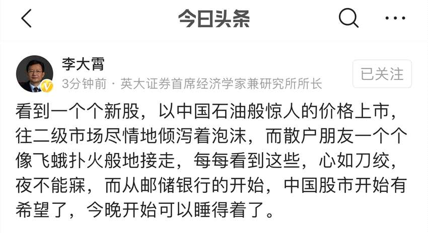 今日,郵儲(chǔ)銀行(601658)在上交所上市交易,英大證券研究所所長(zhǎng)李大霄在公眾平臺(tái)發(fā)文表示, 看到一個(gè)個(gè)新股,以中國(guó)石油般驚人的價(jià)格上市,往二級(jí)市場(chǎng)盡情地傾瀉著泡沫,而散戶(hù)朋友一個(gè)個(gè)像飛蛾撲火般地接走,每每看到這些,心如刀絞,夜不能寐,而從郵儲(chǔ)銀行的開(kāi)始,中國(guó)股市開(kāi)始有希望了,今晚開(kāi)始可以睡得著了。