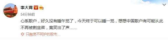 所長(zhǎng)看來(lái)今天心情不錯(cuò),中午又在微博發(fā)文表示,心系散戶(hù),好久沒(méi)有睡午覺(jué)了,今天終于可以睡一覺(jué),想想中國(guó)散戶(hù)有可能從此不再被割韭菜,竟笑出了聲……
