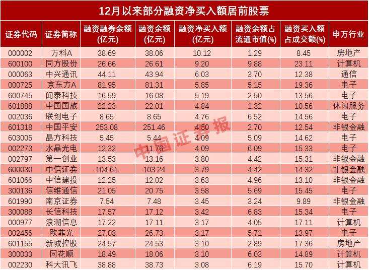 具體到個(gè)股,12月以來(lái),共111只個(gè)股獲融資客加倉(cāng)逾億元。其中,萬(wàn)科A融資凈買(mǎi)入額居首,達(dá)10.12億元;同方股份(600100)居次,為9.20億元;中興通訊、京東方A、聞泰科技(600745)分獲融資凈買(mǎi)入6.03、5.85、5.19億元;中國(guó)國(guó)旅(601888)、聯(lián)創(chuàng)電子(002036)、中國(guó)平安、晶方科技(603005)、水晶光電(002273)融資凈買(mǎi)入額均超過(guò)4億元,【第一創(chuàng)業(yè)(002797)、股吧】(002797)、中信證券、中信建投(601066)等11只股票融資凈買(mǎi)入額也均在3億元以上。
