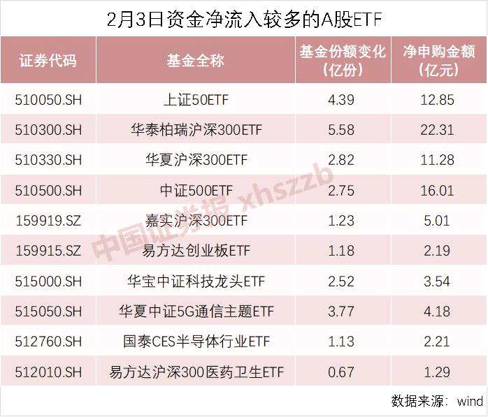 數(shù)據(jù)顯示,2月3日A股ETF逆市增長29.95億份,資金凈流入約90.48億元。具體看,主要寬基指數(shù)ETF如華夏上證50ETF、華泰柏瑞滬深300ETF、華夏滬深300ETF、嘉實滬深300ETF、南方中證500ETF、易方達創(chuàng)業(yè)板ETF份額均有增長。