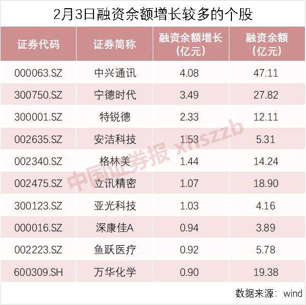 2月3日,兩市融資余額減少113.82億元,但仍有不少個股融資余額逆市增長。中興通訊、寧德時代融資余額分別增長4.08億元、3.49億元,特銳德(300001)、安潔科技(002635)、格林美(002340)、立訊精密、亞光科技(300123)的融資余額增長也都超過1億元。