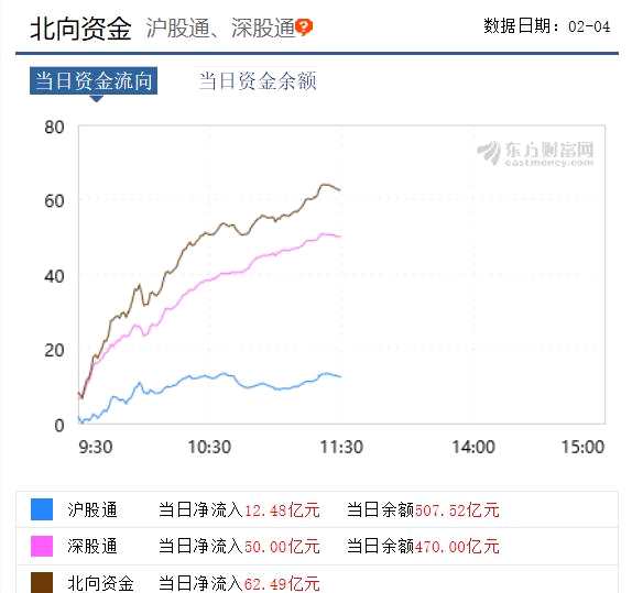 值得注意的是,2月4日早盤,北向資金再度流入62.49億元。數(shù)據(jù)顯示,滬股通早盤流入12.48億元,深股通流入50.00億元,合計流入62.49億元。
