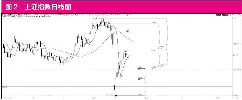 從周線圖上我們看到,春節(jié)假期后大盤巨幅跳空下跌到啟動它筑底反轉(zhuǎn)第二階段的月線匯聚支撐區(qū)域COP=2737/F5=2765一線后立刻反彈拉出一根大陽線,本周繼續(xù)反彈回升到達25X5均線處。從多頭的角度來看,大盤有可能在COP=2737一線的匯聚支撐區(qū)域第二次開啟筑底反轉(zhuǎn)的第二階段,但前提是大盤持續(xù)回升并收破帝法壓力點位COP=3135。從空頭的角度來看,大盤跌破F5=2552后開啟了空頭下跌的敞口同時目前也仍處于MACD死叉狀態(tài)中,所以今后幾周它也可能結(jié)束反彈再次掉頭下跌。大盤后市可能遇阻掉頭的位置有:1)目前的位置,2)F5=2958,3)F5=3058。下面讓我們來看一下日線圖(見圖2):