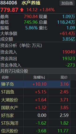 國(guó)產(chǎn)水聯(lián)、大湖股份的牛股紛紛翻紅,整個(gè)水產(chǎn)板塊收漲近2個(gè)點(diǎn)。