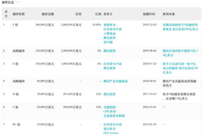 據(jù)數(shù)據(jù)庫顯示,公司共經(jīng)歷10輪融資,紅杉資本、淡馬錫、騰訊投資加持。其中,2012年4月迎來500萬美元A輪融資,晨興資本獨家投資。2014年6月融資1000萬美元,DCM中國、紅杉資本、順位資本投資;2015年1月,紅杉資本等再度投資1億美元;2016年3月,百度投資并購部等投資2.5億美元,估值20億美元。2017年3月,公司迎來D輪融資,由騰訊獨家投資3.5億美元,持股占比12%,投后估值29.16億美元;2018年4月騰訊再度投資4億美元,2018年快手迎來10億美元的E輪融資,由紅杉資本、騰訊投資,投后估值180億美元。2019年8月,騰訊再度戰(zhàn)略投資12.5億美元,投后估值250億美元;2019年12月,騰訊、云鋒基金、淡馬錫、紅杉資本等投資30億美元,投后估值286億美元。