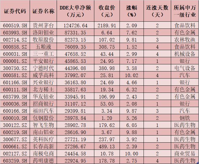 一、周三(2月3日)DDE大單資金凈買入TOP20