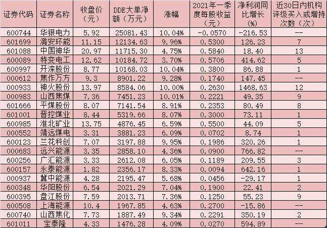 表:5月10日受到1000萬元以上大單資金追捧的煤炭股一覽