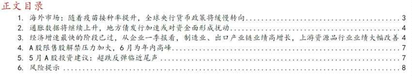 五、5月A股投資建議:超跌反彈臨近尾聲,建議謹(jǐn)慎待時(shí)。 4月以來美債利率有所下行,在北向資金的大幅流入下,A股呈現(xiàn)階段性反彈。 5月份隨著海外疫情好轉(zhuǎn),全球央行寬松政策的緩慢退出是主要方向;地方債發(fā)行加速可能對(duì)銀行間流動(dòng)性產(chǎn)生擾動(dòng),市場(chǎng)風(fēng)險(xiǎn)偏好降低的環(huán)境下限售股解禁壓力加大或影響A股走勢(shì)節(jié)奏,同時(shí)通脹擔(dān)憂短期難以緩解,市場(chǎng)情緒需時(shí)間修復(fù),建議謹(jǐn)慎待時(shí)。 關(guān)注三條主線: 1)一季報(bào)業(yè)績改善,受益于PPI回升行業(yè),如“ 化工、采掘 ”; 2)高股息率行業(yè),如“ 鋼鐵、銀行 ”; 3)政治局會(huì)議強(qiáng)調(diào)加快推進(jìn)發(fā)展主題: “ 碳中和 ”。