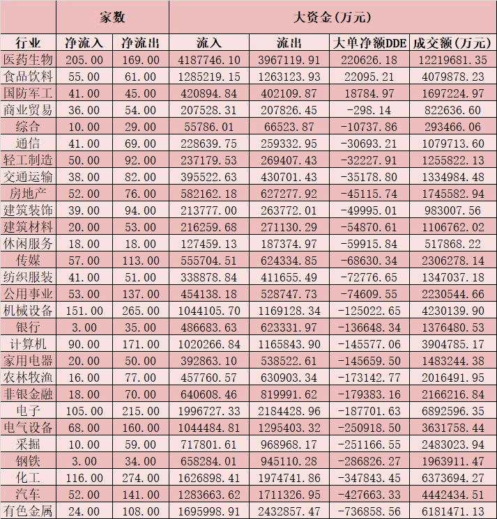 從資金層面看,周四,A股大單資金整體凈流出18.41億元,其中,有1691只個(gè)股呈現(xiàn)資金凈流入,2494只個(gè)股呈現(xiàn)資金凈流出。從申萬(wàn)一級(jí)的28個(gè)行業(yè)來看,有3個(gè)行業(yè)呈現(xiàn)資金凈流入態(tài)勢(shì),其中,醫(yī)藥生物大單資金凈流入居首,達(dá)到22.06億元,食品飲料、國(guó)防軍工等兩行業(yè)資金凈流入分別為2.21億元、1.88億元。另外,25個(gè)行業(yè)均呈現(xiàn)資金凈流出態(tài)勢(shì),其中,有色金屬、汽車、化工等行業(yè),資金凈流出均超30億元。