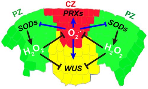 先前研究有報(bào)道過(guò)氧化氫在動(dòng)物干細(xì)胞分化的調(diào)控有著重要作用。該項(xiàng)研究表明,超氧根和過(guò)氧化氫作為新的信號(hào)調(diào)控植物干細(xì)胞的維持與分化。在植物莖頂端分生組織(SAM)中,超氧根主要在干細(xì)胞CZ富集,而過(guò)氧化氫主要在分化細(xì)胞PZ富集,這種分布模式依賴(lài)于一系列活性氧代謝基因在SAM中特異表達(dá)模式,研究發(fā)現(xiàn)絕大多數(shù)的超氧化物歧化酶特異在分化細(xì)胞PZ表達(dá)而過(guò)氧化物酶在干細(xì)胞CZ特異表達(dá)。CZ區(qū)超氧根通過(guò)正調(diào)控植物干細(xì)胞重要調(diào)控基因WUS的表達(dá)從而維持干細(xì)胞的穩(wěn)定;而PZ區(qū)過(guò)氧化氫可以促進(jìn)細(xì)胞分裂調(diào)控分化過(guò)程。此外,研究還發(fā)現(xiàn)超氧根和過(guò)氧化氫之間形成balance、相互拮抗,并通過(guò)調(diào)控WUS而決定干細(xì)胞的命運(yùn)。該研究揭示這種新的干細(xì)胞調(diào)控的信號(hào)可能在植物和動(dòng)物中是保守的,并為研究ROS-介導(dǎo)的干細(xì)胞命運(yùn)的調(diào)控機(jī)制提供了理論基礎(chǔ)。