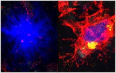 溶酶體在細(xì)胞內(nèi)起著分解“廢物”的作用。最近,耶魯大學(xué)的科學(xué)工作者確信他們已經(jīng)發(fā)現(xiàn)這些“垃圾回收站”是如何引起阿爾茲海默癥淀粉樣斑塊的:神經(jīng)元的溶酶體轉(zhuǎn)運過程非常重要,如果這個轉(zhuǎn)運過程出錯的話,溶酶體會在β-淀粉樣蛋白沉淀導(dǎo)致軸突脹大的神經(jīng)細(xì)胞里逐步增多,此項研究發(fā)表在JCB上。