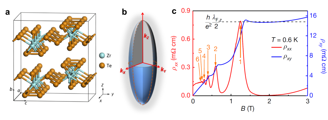 圖2:a: ZrTe5的晶格結(jié)構(gòu)。b:實驗測量的費米面形狀。該費米面是封閉的,表征該電子體系的三維特性。c: 三維量子霍爾現(xiàn)象