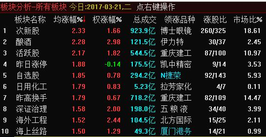 從盤面上看,白酒、次新股、福建自貿(mào)區(qū)、家用電器等板塊漲幅居前;鋼鐵、煤炭、稀缺資源等板塊跌幅居前。白酒股持續(xù)反彈創(chuàng)出新高,表明機(jī)構(gòu)資金對(duì)白酒股青睞有加,按照其以往的歷史規(guī)律,大資金之中的社保資金、保險(xiǎn)資金等對(duì)于具有估值優(yōu)勢(shì)的大盤藍(lán)籌股向來(lái)會(huì)持續(xù)追蹤,具有估值優(yōu)勢(shì)的藍(lán)籌白酒股自然是其首選標(biāo)的。同時(shí),業(yè)象征著短期股指結(jié)構(gòu)性行情的延續(xù)性值得期待。比如近期中字頭個(gè)股的投資機(jī)會(huì)明顯較強(qiáng),中國(guó)神華,中國(guó)化學(xué)等紛紛大幅上漲。特別是次新股的強(qiáng)者恒強(qiáng),更是對(duì)市場(chǎng)的投資人氣構(gòu)成強(qiáng)有力刺激,受到年報(bào)陸續(xù)披露,次新股高送轉(zhuǎn)接連不斷,自然是資金持續(xù)追捧的投資標(biāo)的,昨日我們一直就提示,次新股的走強(qiáng)具有持續(xù)性,也將帶動(dòng)市場(chǎng)多方人氣,支撐大盤維持反彈趨勢(shì),如今看來(lái)一切盡在預(yù)料之中。