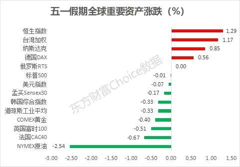 而假日期間,全球其他未休市場漲跌情況不一,股市以中國香港和中國臺灣市場表現(xiàn)突出,其次是納斯達克和德國DAX指數(shù),跌幅較大的則是英法兩國股市,不過總體均在正常波動范圍,并無異常情況出現(xiàn)。相比股市,其他重要資產(chǎn)的波動更為可觀,其中NYMEX原油大跌2.54%,COMEX黃金微跌0.4%,美元指數(shù)微跌0.07%。