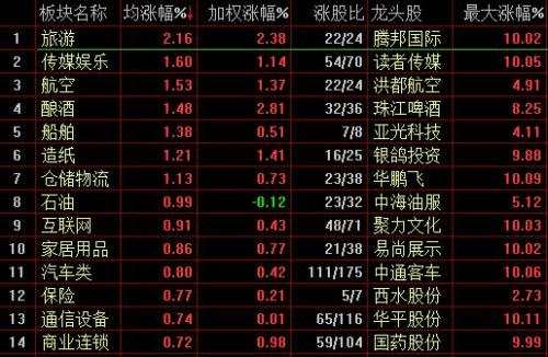 行業(yè)板塊多數(shù)飄紅,旅游、傳媒娛樂(lè)、航空、釀酒、船舶漲幅居前;供氣供熱、電信運(yùn)營(yíng)、商貿(mào)代理、公共交通、半導(dǎo)體跌幅靠前。