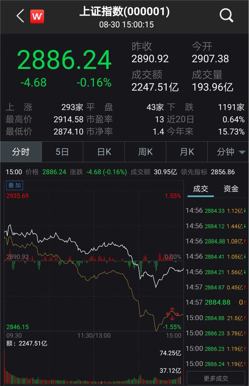 8月30日電周五(30日),A股集體高開,滬指早盤一度沖上2900點,隨后震蕩下行。午后,13時50分左右,三大股指先后翻綠,電子、通信板塊跳水。尾盤階段,三大股指跌幅收窄,滬指小幅收跌不足0.2%。
