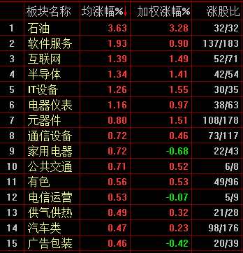 盤面上,行業(yè)板塊漲多跌少,石油、軟件服務、互聯(lián)網(wǎng)、半導體、IT設備、電器儀表、元器件等板塊漲幅居前;保險、證券、銀行、航空、運輸服務、釀酒、旅游、建筑等板塊跌幅居前。