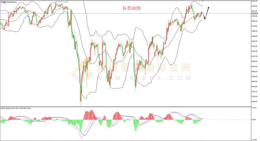 從標普4H周期看,其走勢結(jié)構(gòu)略強于道指走勢,昨日道指4H周期創(chuàng)出新低,標普并未走出新低,目前處于布林線中軌附近。結(jié)合4H周期MACD指標來看,快慢線在零軸附近粘合,面臨方向選擇,由于標普前期為多頭趨勢,所以后市上漲概率較大。當前價格在4H周期布林線中軌附近存在一定壓力,短線或有回調(diào),日內(nèi)操作可等待價格回落至4H周期布林線下軌2990附近嘗試多單,目標看布林線上軌3020附近。