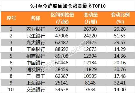 滬股通方面,9月至今加倉數(shù)量最多的10只個股中,銀行股占據(jù)9席
