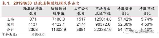 招商證券最新數(shù)據(jù)顯示,2019年9月末陸股通持股市值為11603億元,較前一個月提高664億元;占同期A股自由流通股市值的比例為5.19%,較前期繼續(xù)上升0.23%。