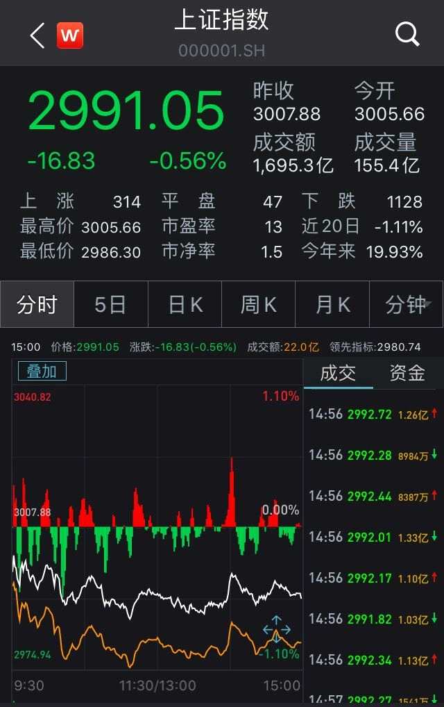 截至收盤,滬指報(bào)2991.05點(diǎn),跌0.56%,成交1695.32億元;深成指報(bào)9671.73點(diǎn),跌1.17%,成交2896.17億元;創(chuàng)業(yè)板指報(bào)1660.89點(diǎn),跌1.10%,成交1094億元。