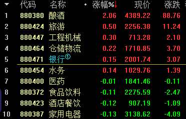今日在滬深股市縮量回調(diào)、個(gè)股普跌的背景下,以釀酒、銀行為代表的大市值藍(lán)籌板塊逆勢(shì)走強(qiáng)。銀行指數(shù)(880471)小漲0.15%,位列兩市行業(yè)板塊漲幅第五位。
