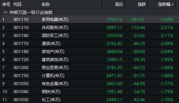 28個申萬一級行業(yè)指數(shù)悉數(shù)下跌,其中家電板塊跌幅居首,白電雙雄格力電器和【美的集團(tuán)(000333)、股吧】更是雙雙跌逾4%。