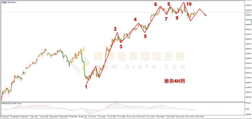 德指日K線上看,上周創(chuàng)出13375的高點(diǎn)之后,出現(xiàn)了快速下行,日K線形態(tài)上收出了較長(zhǎng)的上引線,說(shuō)明該區(qū)間有較大的壓力。從4小時(shí)結(jié)構(gòu)圖形上來(lái)看,從1-10的拉升過(guò)程中,都呈現(xiàn)出了低點(diǎn)不斷上移,高點(diǎn)不斷創(chuàng)新高的標(biāo)準(zhǔn)趨勢(shì)上行走勢(shì),而上周創(chuàng)出10的高點(diǎn)以后的快速回落擊穿了之前的低點(diǎn)9的位置,上升通道被改變。同時(shí)從1開始的上行,漲幅巨大,因此德指有較高概率會(huì)從高位回落。建議投資者以逢高空的思路為主。