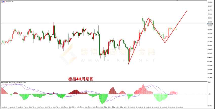 從德指4H周期走勢結構看,行情整體處在高位震蕩盤整結構中,從短線來看,行情自低位上攻,其后遇阻回落,回落獲得支撐反彈,目前短線仍然處在反彈的階段中,從MACD形態(tài)看,目前處在金叉過程,紅柱有出現再次放大的趨勢,反彈行情為上漲轉為盤整,再次上漲的結構,目前處在短線二次上漲過程,有進一步調整前高的勢頭,策略上建議逢低布局多單為主。