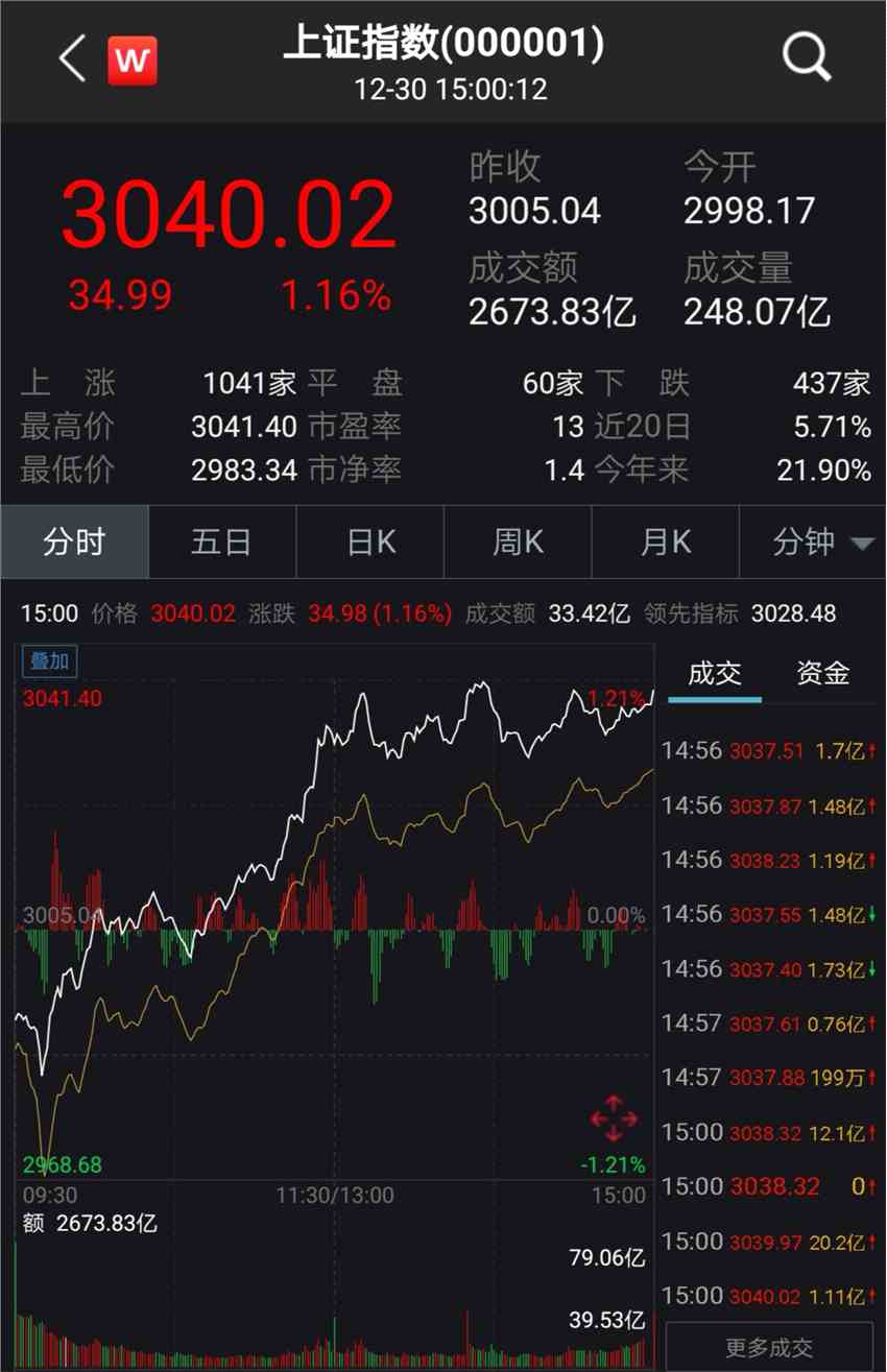 截至收盤,滬指報3040.02點,漲1.16%,成交額2674億元;深成指報10365.96點,漲1.29%,成交額3436億元;創(chuàng)業(yè)板指報1790.24點,漲1.28%,成交額1122億元。