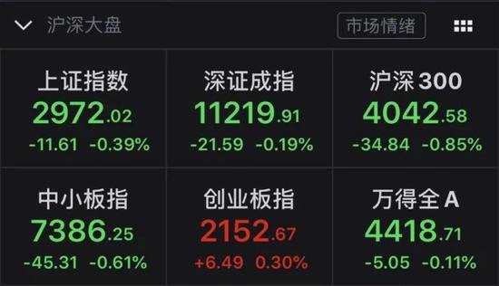 摘要: 今日早盤,兩市沖高回落,盤中創(chuàng)業(yè)板指最大漲幅超過1%。截至午間收盤,上證指數(shù)下跌0.39%,報2972.02點;深證成指下跌0.19%至11219.91點,創(chuàng)業(yè)板指上漲0.30%,報2152.67點。