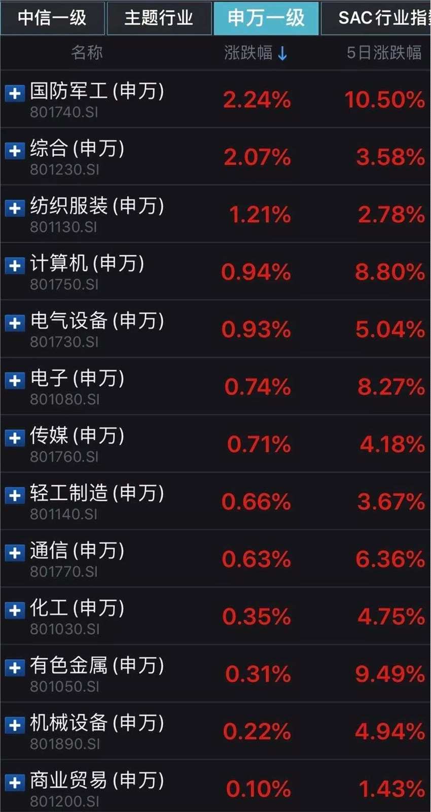 從盤面上看,昨日上漲6.35%的國航軍工概念今日繼續(xù)領(lǐng)漲,截至午間收盤,申萬一級28個行業(yè)中有13個行業(yè)上漲,1個行業(yè)收平,國防軍工、綜合、紡織服裝行業(yè)漲幅居前,分別上漲2.24%、2.07%、1.21%。此外,科技板塊的計算機、電子、通信行業(yè)也有一定上漲。在下跌的14個行業(yè)中,房地產(chǎn)、建筑材料、家用電器行業(yè)跌幅居前,分別下跌1.37%、1.37%、1.14%。