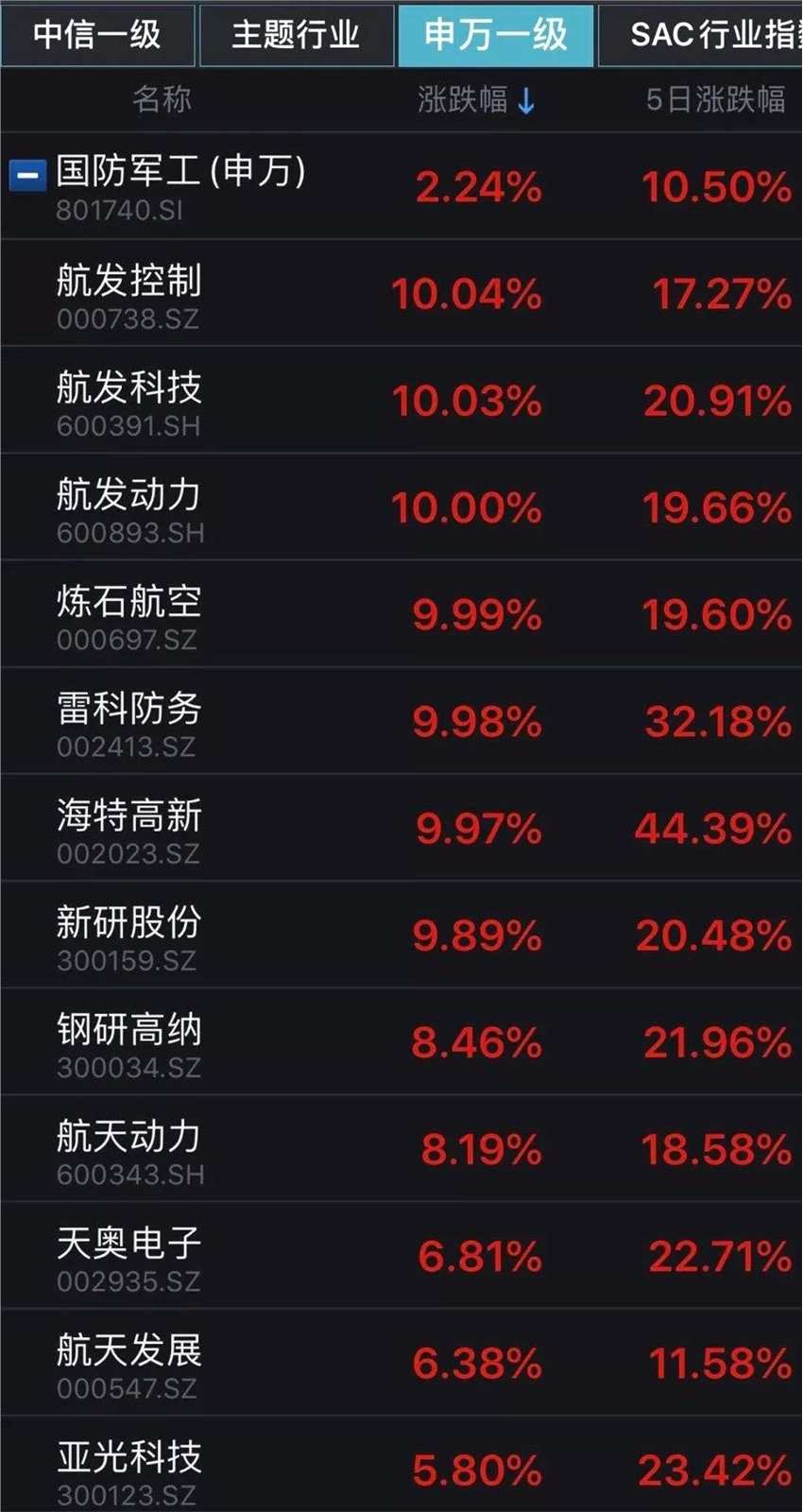 從持續(xù)領(lǐng)漲的國防軍工概念情況來看,截至午間收盤,國防軍工概念內(nèi)航發(fā)控制、【航發(fā)科技(600391)、股吧】、航發(fā)動力、煉石航空、雷科防務(wù)、海特高新、新研股份等漲停。