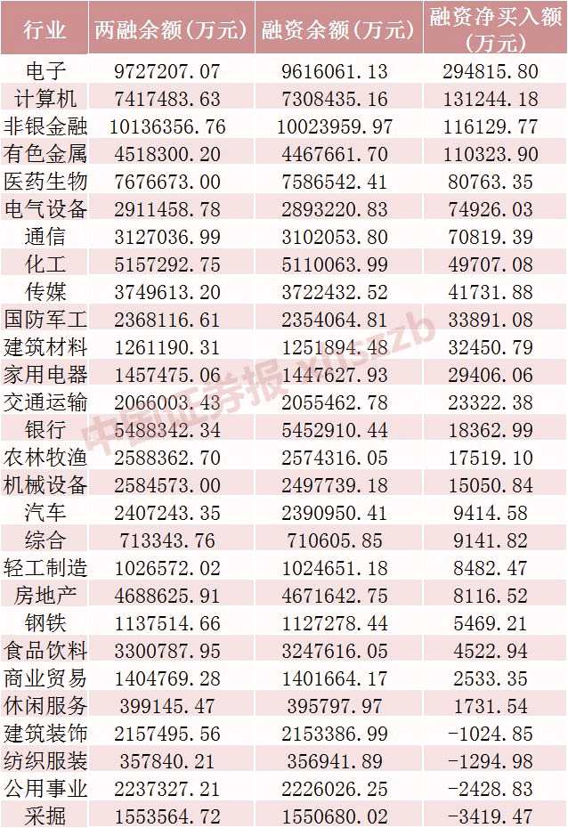 Wind數(shù)據(jù)顯示,在2月17日,融資客對申萬一級28個行業(yè)中的24個行業(yè)板塊進行了加倉,融資凈買入居前的行業(yè)為電子、計算機、非銀金融行業(yè),分別凈買入29.48億元、13.12億元、11.61億元。此外,有色金屬行業(yè)的凈買入金額也超過了10億元。僅有采掘、公用事業(yè)、紡織服裝、建筑裝飾行業(yè)小幅減倉。