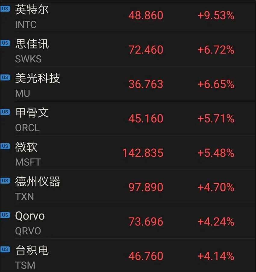 科技股表現(xiàn)出色,英特爾漲9.53%,甲骨文漲5.71%,微軟漲5.48%。