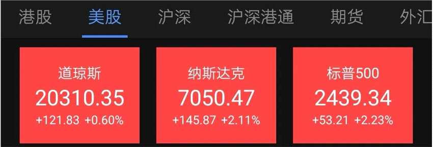 隨后,美股自低位反彈,截至發(fā)稿時,道指漲0.6%,報20310.35點,納指漲2.11%,報7050.47點,標普500漲2.23%,報2439.34點。