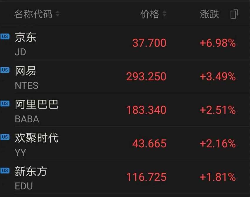 部分中概股也大幅反彈,其中,京東漲6.98%,網(wǎng)易漲3.49%、阿里巴巴漲2.51%。
