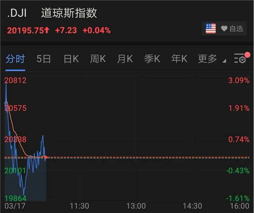 摘要: 美股17日開盤反彈,三大股指盤初均漲逾2%。然而,開盤后十幾分鐘,美股沖高回落,隨后由漲轉(zhuǎn)跌,道指更是跌破20000點大關(guān)。此后隨著部分流動性利好消息傳出,美股低位反彈,納指、標普500指數(shù)轉(zhuǎn)漲超2%