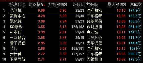 概念板塊多數(shù)上漲,光刻機(jī)、數(shù)據(jù)中心、5G概念、新零售、三網(wǎng)融合、芯片等板塊漲幅靠前;口罩防護(hù)、風(fēng)沙治理、生物疫苗、土地流轉(zhuǎn)、民營醫(yī)院等板塊跌幅靠前。