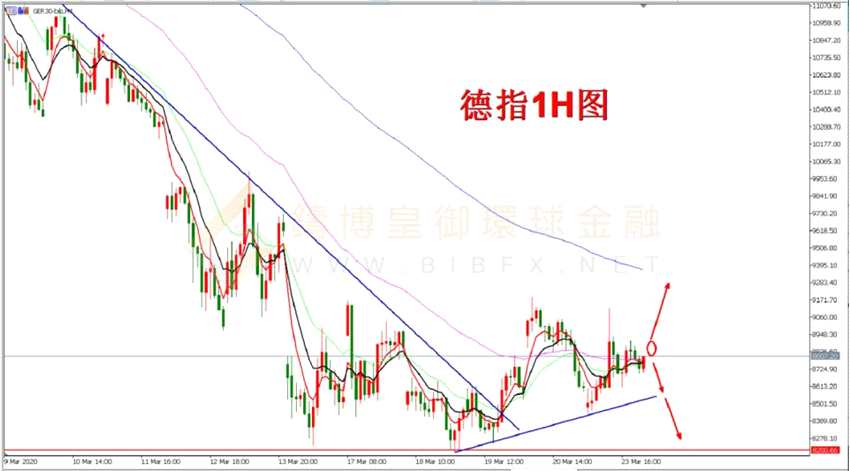 德指一小時周期,從形態(tài)上看,德指以8208為低點形成的短期上升趨勢線的支撐是有效,昨日德指向下測試趨勢線在8430附近的支撐,未能下破,并再次企穩(wěn),且MA5、MA10均線再次金叉,表明短線多頭動能較強,尤其是MA60均線在8800附近的壓制,上破后有望迎來加速上漲行情,上方關注9150壓力位,上破后將看向10300一線,但若指數(shù)選擇再次下破上行趨勢線在8560附近的支撐,則需留意8200的前低支撐,考慮到早間全球股指普遍上漲;操作上,今日可以在8930附近做多德指。