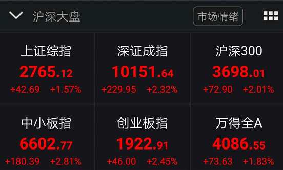 Wind數(shù)據(jù)顯示,截至午間收盤(pán),上證指數(shù)漲1.57%,報(bào)2765.12點(diǎn);深證成指漲2.32%,報(bào)10151.64點(diǎn);創(chuàng)業(yè)板指漲2.45%,報(bào)1922.91點(diǎn);中小板指漲2.81%,報(bào)6602.77點(diǎn)。