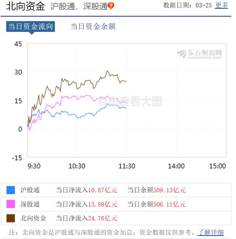 資金流向方面,互聯(lián)網(wǎng)數(shù)據(jù)顯示,截至25日午間收盤(pán),北向資金合計(jì)凈流入資金24.76億元;其中滬股通資金凈流入10.87億元,深股通資金凈流入13.89億元。前一日北向資金合計(jì)凈流入39.87億元。