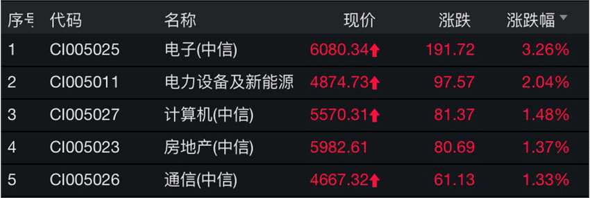 Wind數(shù)據(jù)顯示,截至午間收盤,電子板塊漲3.26%,領(lǐng)漲中信一級(jí)行業(yè)板塊;板塊內(nèi)華天科技、天華超凈、通富微電、艾比森漲停。計(jì)算機(jī)、通信板塊漲幅均靠前。