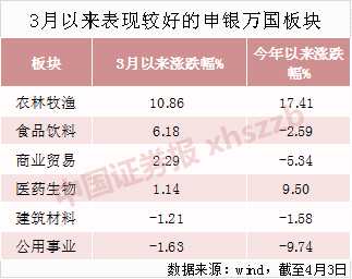 事實(shí)上,3月以來(lái),以消費(fèi)股為代表的內(nèi)需板塊表現(xiàn)十分強(qiáng)勢(shì),逆市斬獲正收益。Wind數(shù)據(jù)顯示,截至4月3日,農(nóng)林牧漁板塊漲幅達(dá)10.86%,食品飲料、商業(yè)貿(mào)易也分別上漲了6.18%、2.29%。