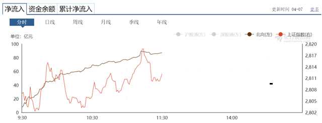 4月7日上午,A股跳空收復(fù)2800點(diǎn)!東方財(cái)富數(shù)據(jù)顯示,截至上午收盤,北向資金凈流入86.90億元。