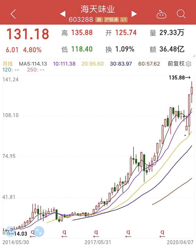近期表現(xiàn)強(qiáng)勢(shì)的消費(fèi)股繼續(xù)賺足眼球,其中海天味業(yè)再次創(chuàng)下歷史新高。Wind數(shù)據(jù)顯示,7日上午,海天味業(yè)盤中創(chuàng)下歷史最高價(jià)135.88元。