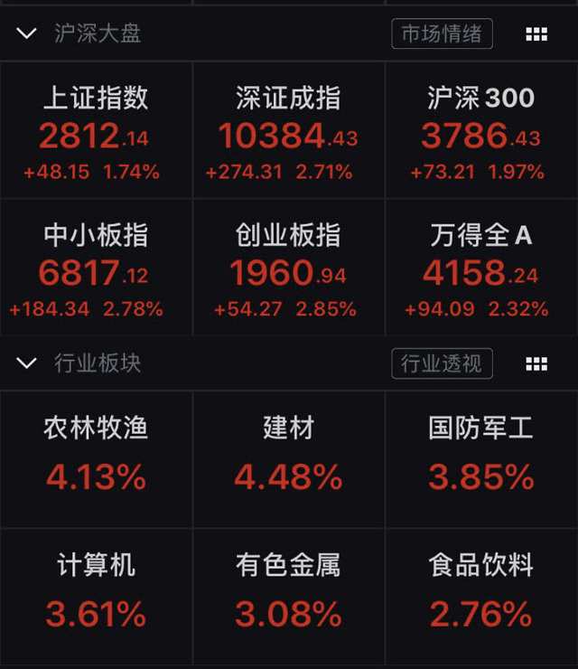 大盤強(qiáng)勢(shì)上漲之下,市場(chǎng)熱點(diǎn)全面開花,科技股、消費(fèi)股、農(nóng)業(yè)板塊均表現(xiàn)突出。Wind數(shù)據(jù)顯示,截至上午收盤,農(nóng)林牧漁板塊上漲4.13%,建材板塊上漲4.48%,計(jì)算機(jī)、食品飲料分別上漲3.61%、2.76%。