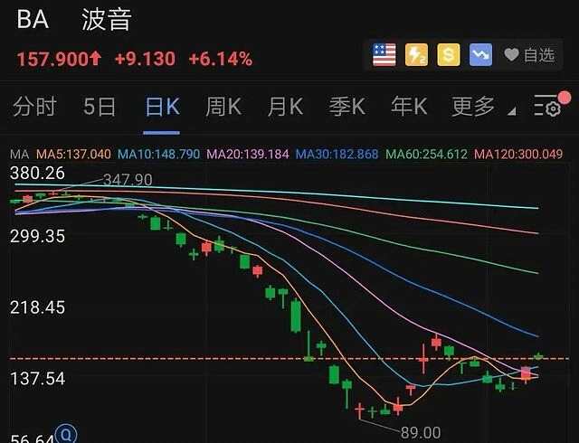波音今日股價(jià)大幅上漲,盤(pán)中一度大漲7.42%,截至發(fā)稿時(shí)波音股價(jià)上漲6.14%,報(bào)157.9美元/股。