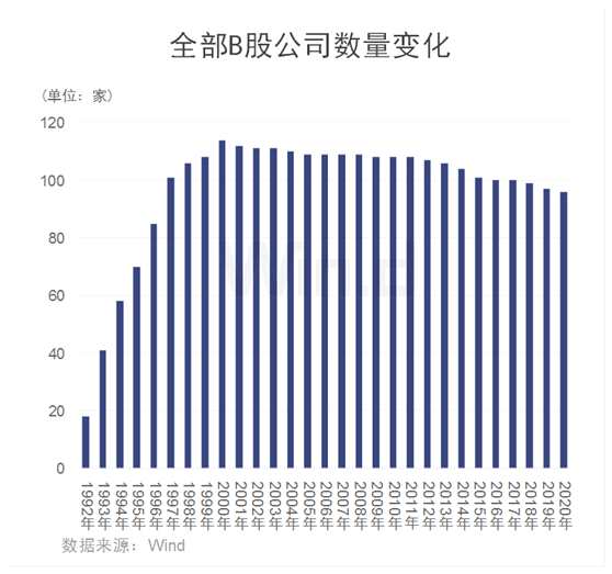 從歷史數(shù)據(jù)來看,B股自1992年建立以來,到2000年,最高峰時(shí)也就只有114只股票,近十多年來,隨著不斷有公司退市,當(dāng)前B股公司數(shù)量已經(jīng)下滑至96家。