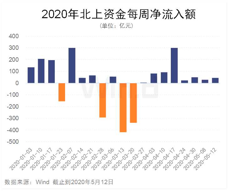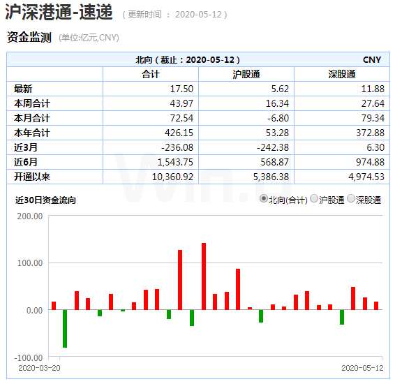 Wind數(shù)據(jù)顯示,5月12日,北上資金當(dāng)日凈流入17.5億元,本周凈流入43.97億元,連續(xù)八周搶籌;雖然近期北上資金單日流向幅度并不是很大,但整體保持持續(xù)流入態(tài)勢(shì)。自2014年11月開通以來,外資通過滬深股通渠道累計(jì)流入A股金額已超萬億。